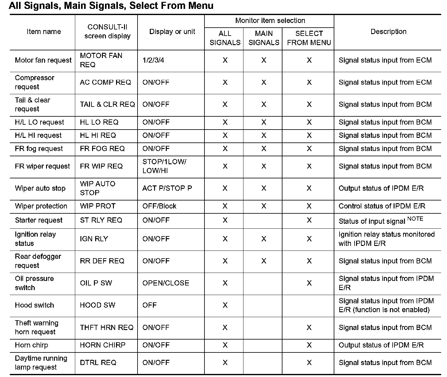 NOTE: Perform monitoring of IPDM E/R data with the ignition switch ON. When the ignition switch is in ACC position, display may not be correct.
