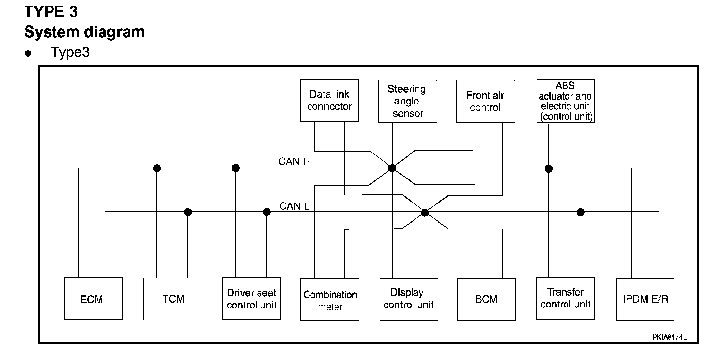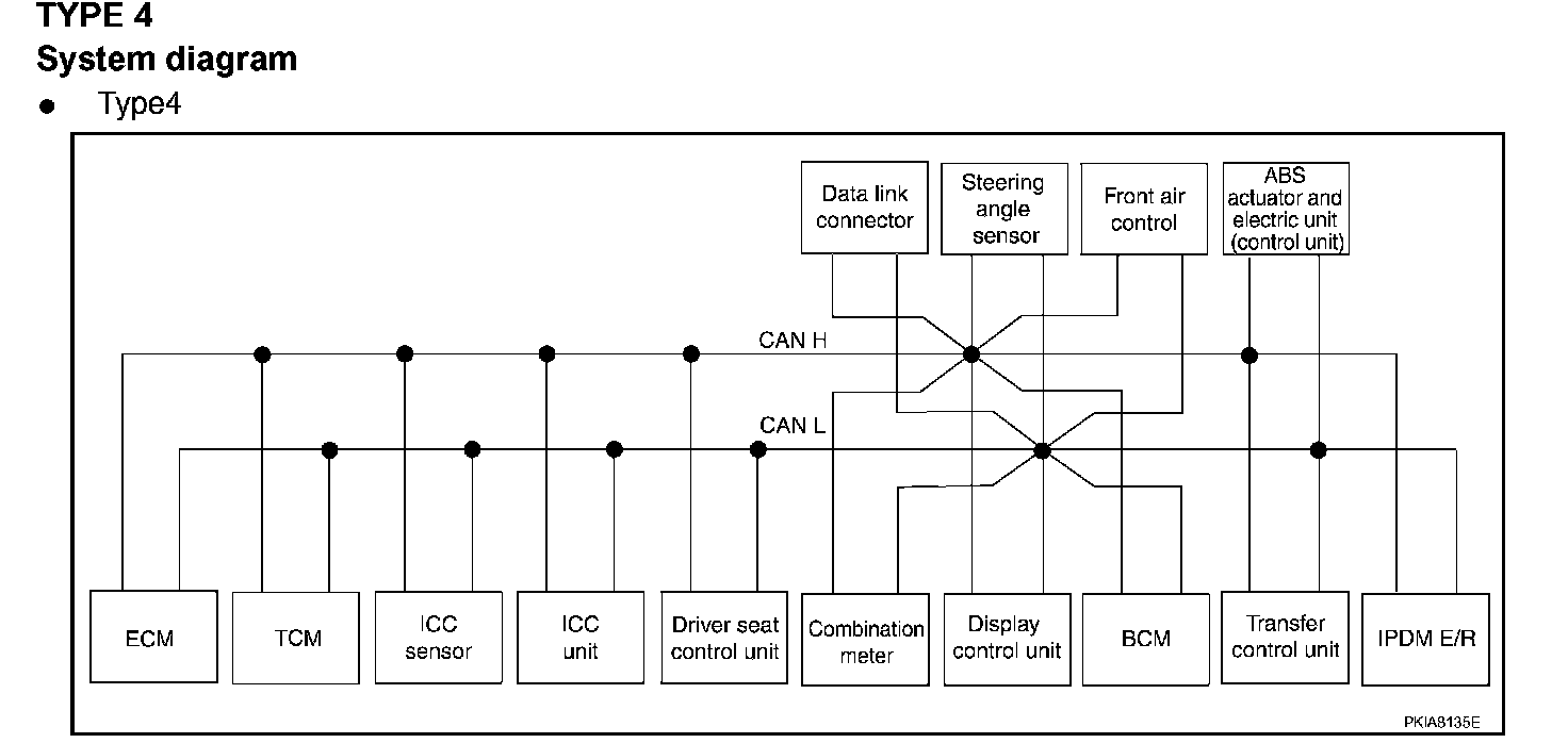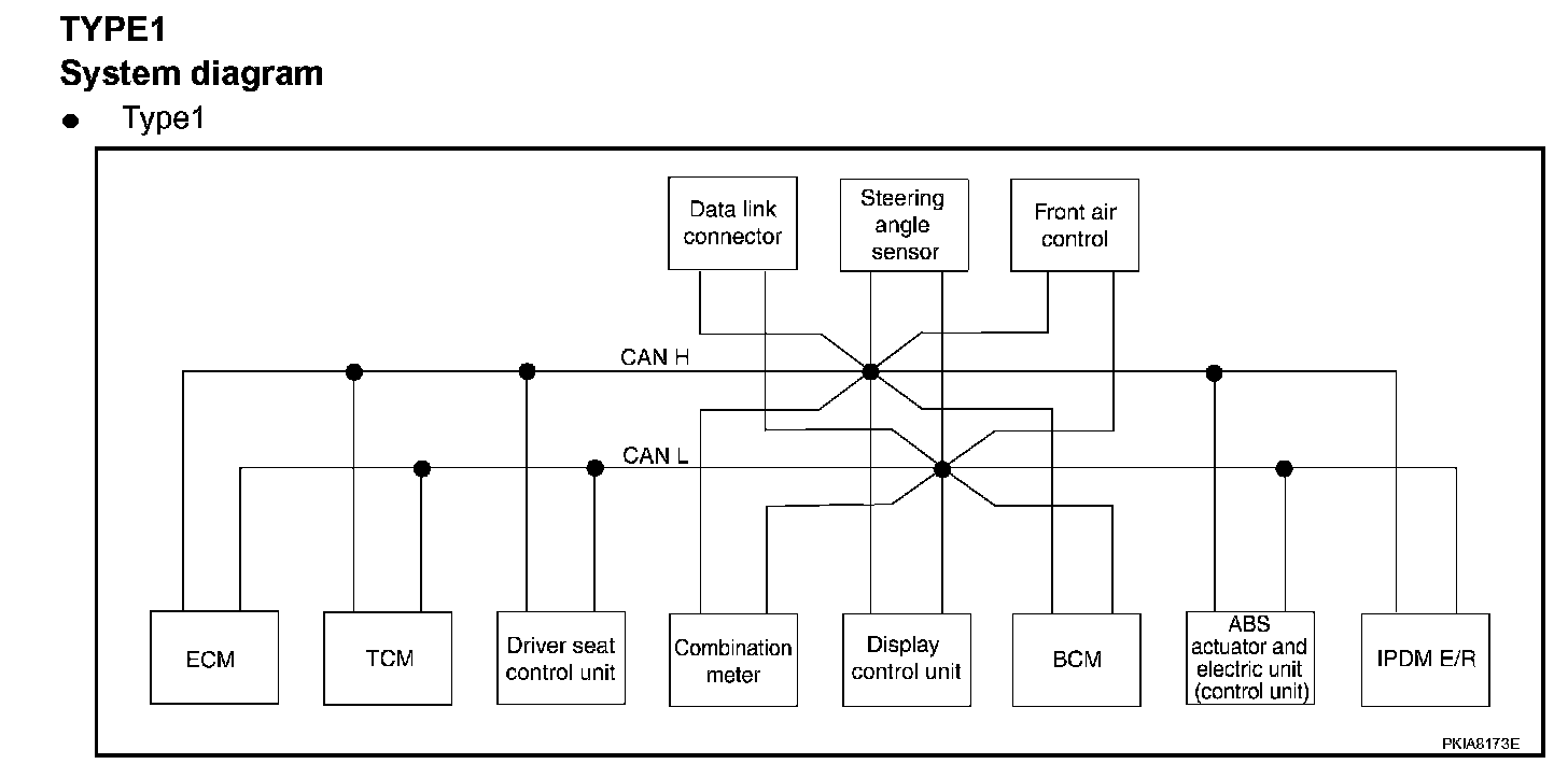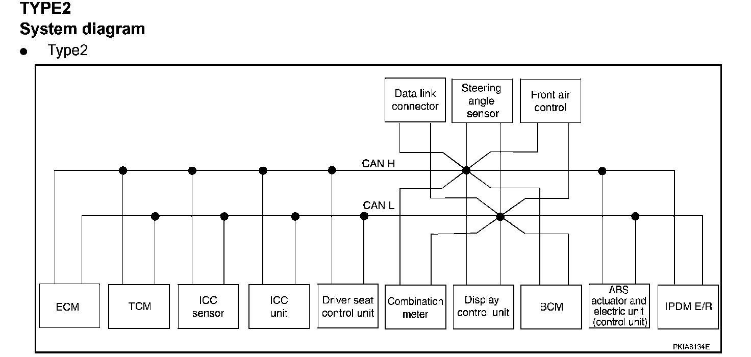 System DescriptionCAN (Controller Area Network) is a serial communication line for real time application. It is an on-vehicle multiplex communication line with high data communication speed and excellent error detection ability. Many electronic control units are equipped onto a vehicle, and each control unit shares information and links with other control units during operation (not independent). In CAN communication, control units are connected with 2 communication lines (CAN H line, CAN L line) allowing a high rate of information transmission with less wiring. Each control unit transmits/receives data but selectively reads required data only.