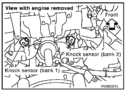 The knock sensor is attached to the cylinder block. It senses engine knocking using a piezoelectric element. A knocking vibration from the cylinder block is sensed as vibrational pressure. This pressure is converted into a voltage signal and sent to the ECM.