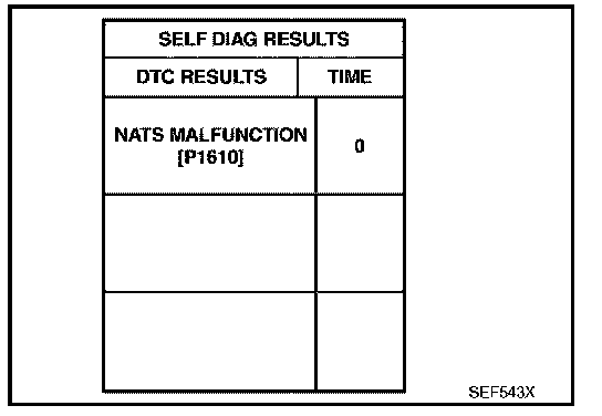 IVIS (Infiniti Vehicle Immobilizer System - NATS)- If the security indicator lights up with the ignition switch in the ON position or "NATS MALFUNCTION" is displayed on "SELF-DIAG RESULTS" screen, perform self-diagnostic results mode with CONSULT-II using NATS program card. Refer to "IVIS (INFINITI VEHICLE IMMOBILIZER SYSTEM-NATS)". Infiniti Vehicle Immobilizer System (IVIS ) - NATS