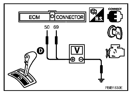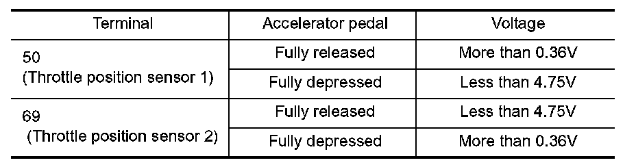 5. Check voltage between ECM terminals 50 (TP sensor 1 signal), 69 (TP sensor 2 signal) and ground under the given conditions.