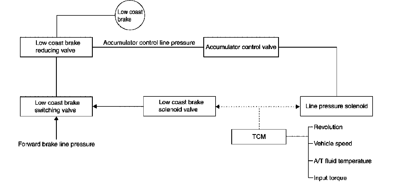 ^ The operation of the low coast brake solenoid switches the low coast brake switching valve and controls the coupling and releasing of the low coast brake. The low coast brake reducing valve controls the low coast brake coupling force.