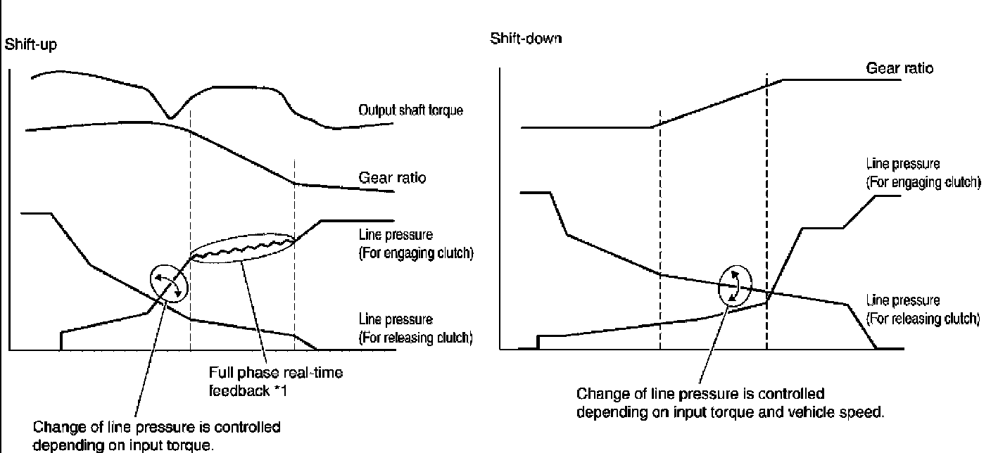 Shift ControlThe clutch pressure control solenoid is controlled by the signals from the switches and sensors. Thus, the clutch pressure is adjusted to be appropriate to the engine load state and vehicle driving state. It becomes possible to finely control the clutch hydraulic pressure with high precision and a smoother shift change characteristic is attained.