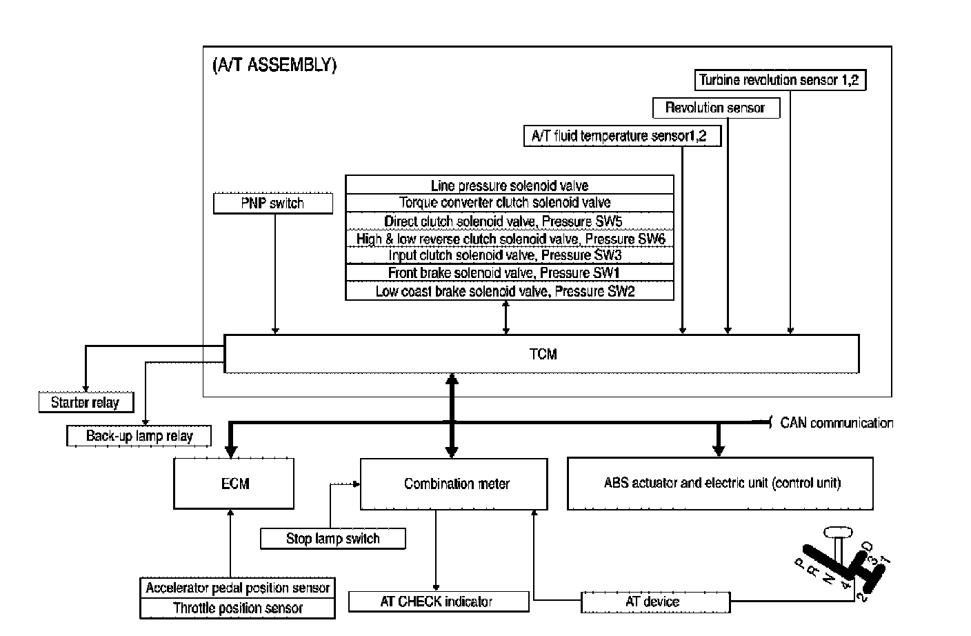 The automatic transmission senses vehicle operating conditions through various sensors or signals. It always controls the optimum shift Position and reduces shifting and lock-us shocks.