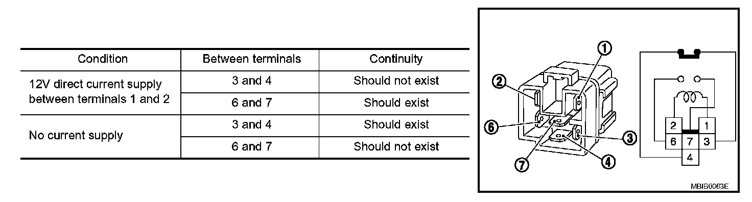 2. Check continuity between relay terminals 3 and 4, 6 and 7 under the given conditions.