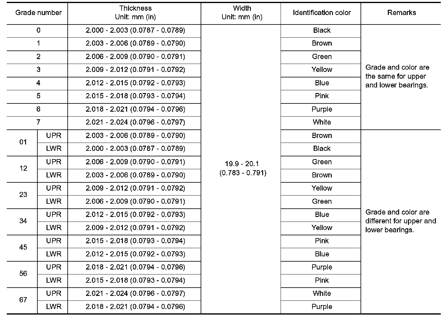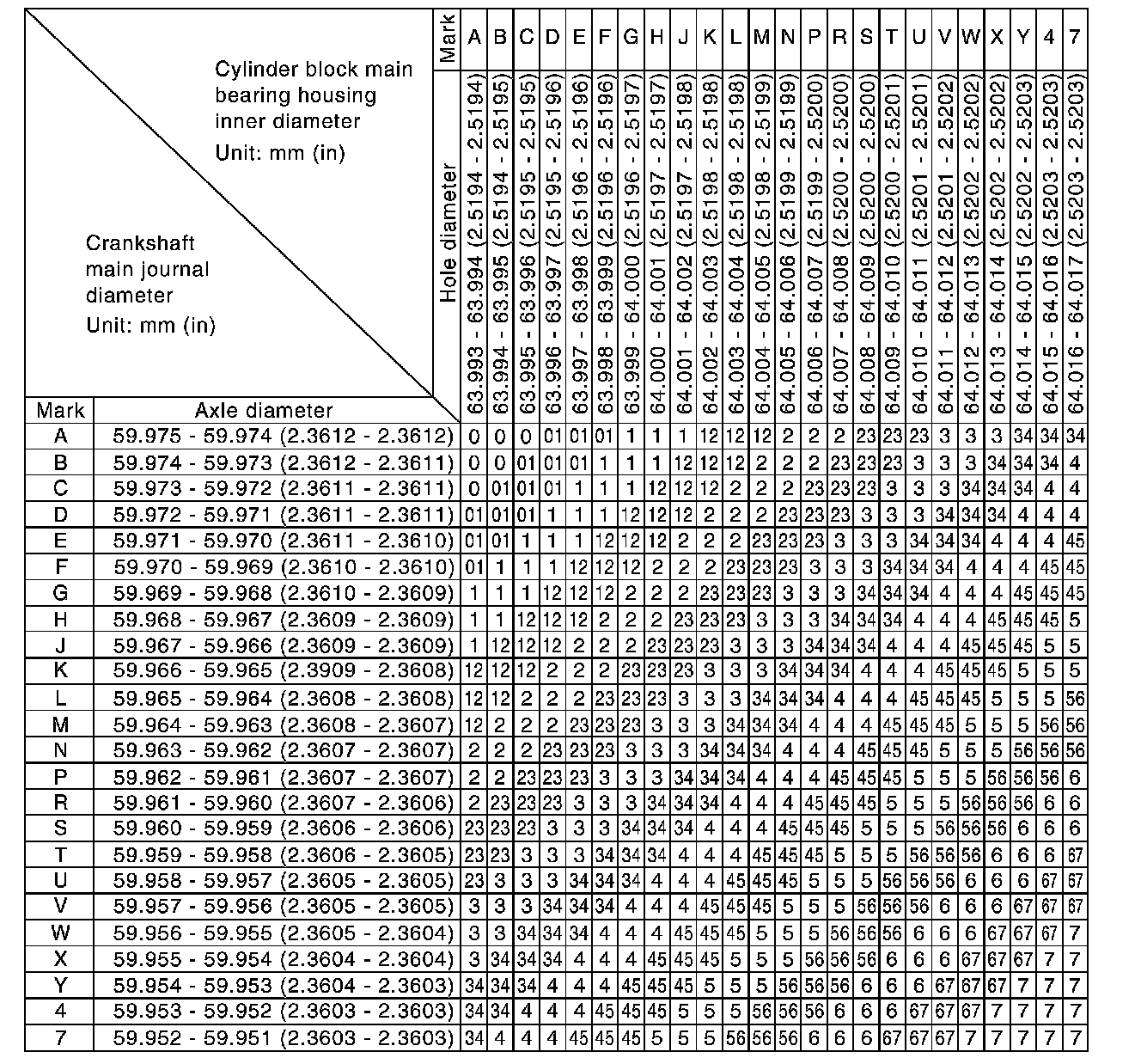 Main Bearing Grade Table (All Journals)