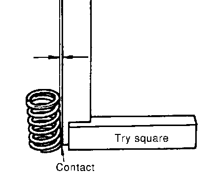 VALVE SPRING SQUARENESS^ Set a try square along the side of valve spring and rotate spring. Measure the maximum clearance between the top of spring and try square.