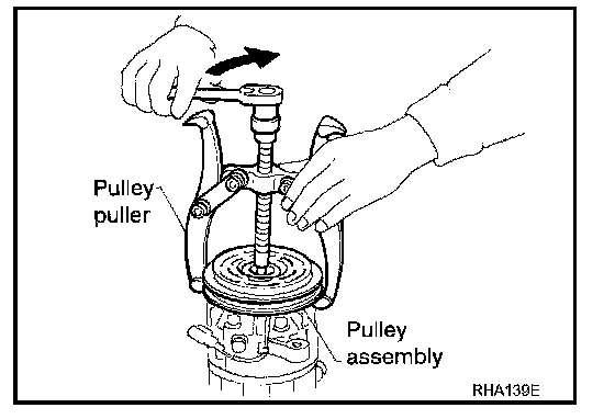 To prevent pulley groove from being deformed, puller claws should be positioned into the edge of the pulley assembly.
