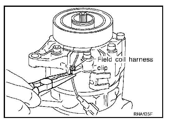5. Remove field coil harness clip using a pair of pliers.