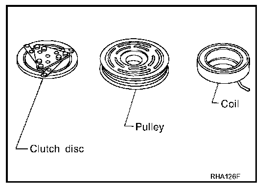 When replacing compressor clutch assembly, always carry out the break-in operation. This is done by engaging and disengaging the clutch about thirty-times. Break-in operation raises the level of transmitted torque.