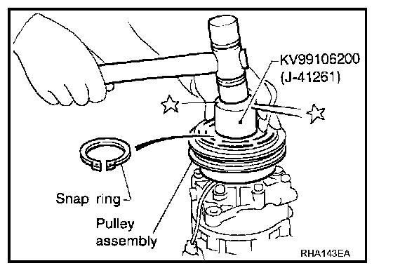 3. Install pulley assembly using installer and a hand press, and then install snap ring using snap ring pliers.