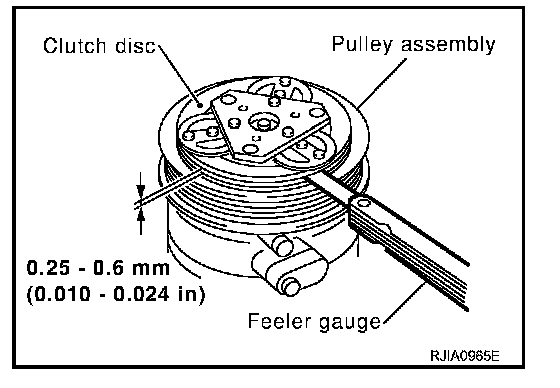 Check appearance of the pulley assembly. If contact surface of pulley sows signs of excessive grooving, replace clutch disc and pulley. Contact surfaces of pulley assembly should be cleaned with a suitable solvent before reinstallation.