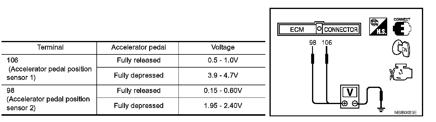 3. Check voltage between ECM terminals 106 (APP sensor 1 signal), 98 (APP sensor 2 signal) and ground under the given conditions.