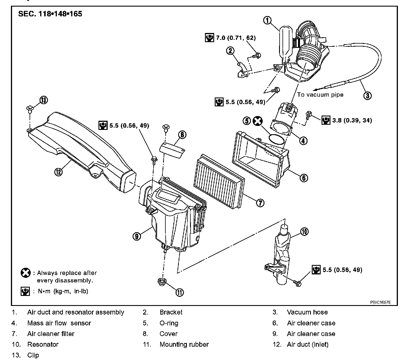 4. Remove air duct (inlet), air cleaner case and mass air flow sensor assembly, air duct and resonator assembly disconnecting their joints.