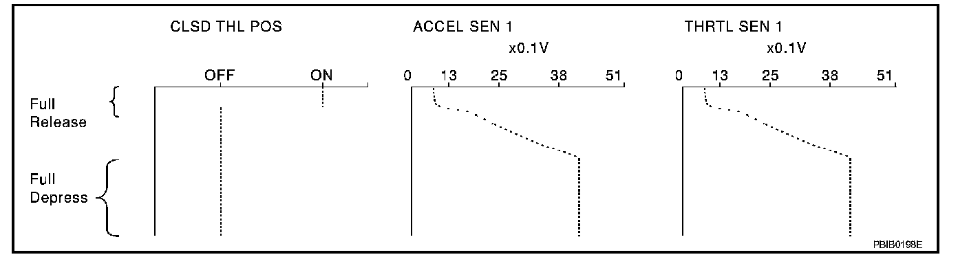 Above is the data for "CLSD THL POS", "ACCEL SEN 1" and "THRTL SEN 1" when depressing the accelerator pedal with the ignition switch ON and with selector lever in D position.