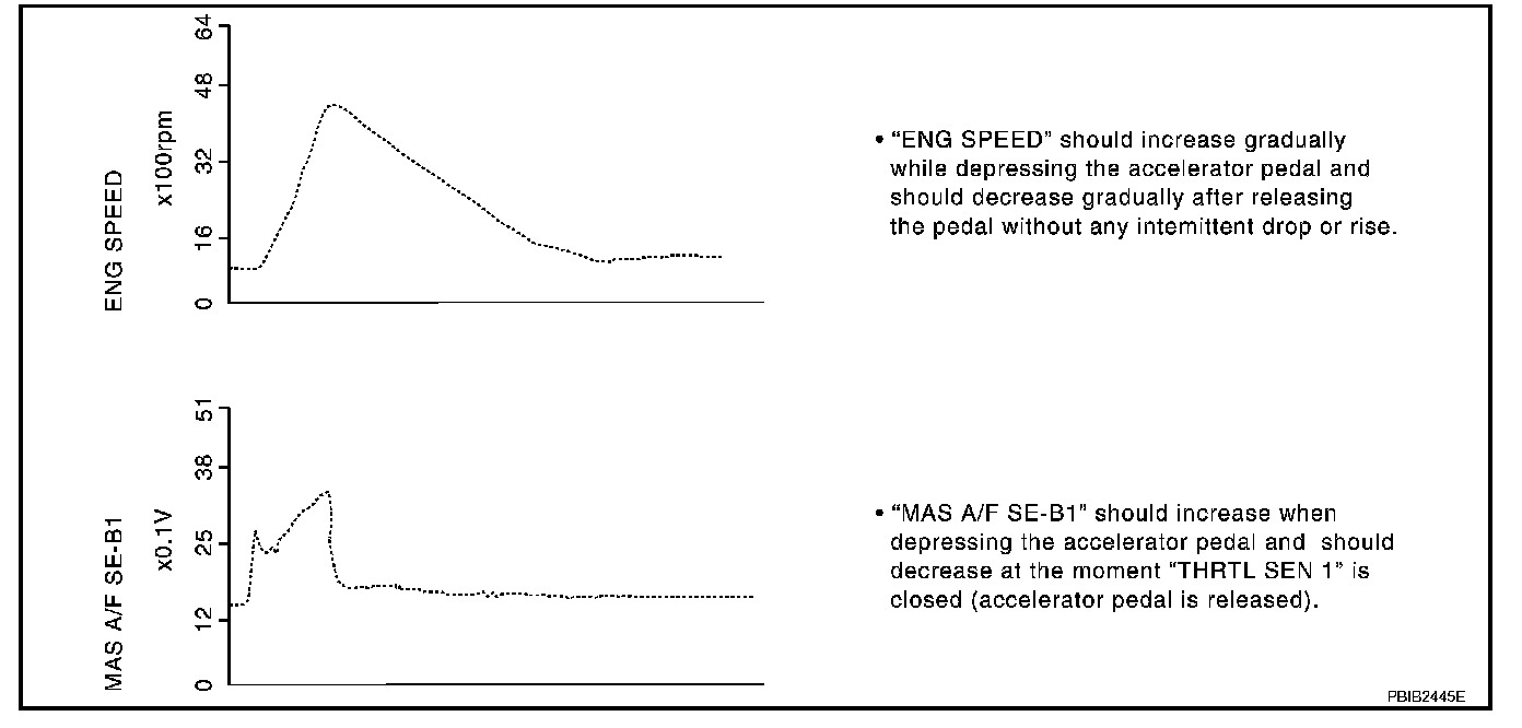 The signal of "ACCEL SEN 1" and "THRTL SEN 1" should rise gradually without any intermittent drop or rise after "CLSD THL POS" is changed from "ON" to "OFF".
