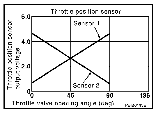 The throttle position sensor has the two sensors. These sensors are a kind of potentiometers which transform the throttle valve position into output voltage, and emit the voltage signal to the ECM. In addition, these sensors detect the opening and closing speed of the throttle valve and feed the voltage signals to the ECM. The ECM judges the current opening angle of the throttle valve from these signals and the ECM controls the throttle control motor to make the throttle valve opening angle properly in response to driving condition.