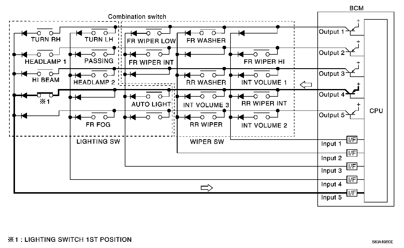 - When lighting switch 1ST position is turned ON, contact in combination switch turns ON. At this time if OUTPUT 4 transistor is activated, BCM detects that voltage changes in INPUT 5.
