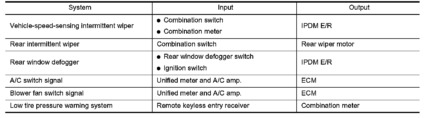 BCM has combination switch reading function for reading the operation of combination switches (light, wiper, washer and turn signal) in addition to a function for controlling the operation of various electrical components. Also it has an interface function allowing it to receive signals from the unified meter and A/C amp., and send signals to ECM using CAN communication.