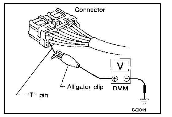 The probe of a digital multimeter (DMM) may not correctly fit the connector cavity. To correctly probe the connector, follow the procedures below using a "T" pin. For the best contact grasp the "T" pin using an alligator clip.