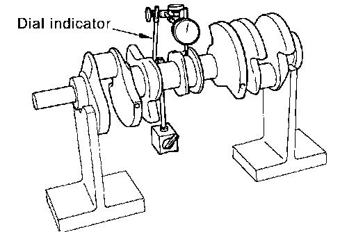 CRANKSHAFT RUNOUT^ Place V-block on precise flat table, and support the journals on the both end of crankshaft.