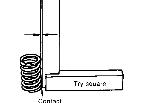 VALVE SPRING SQUARENESS^ Set try square along the side of valve spring and rotate spring. Measure the maximum clearance between the top face of spring and try square.