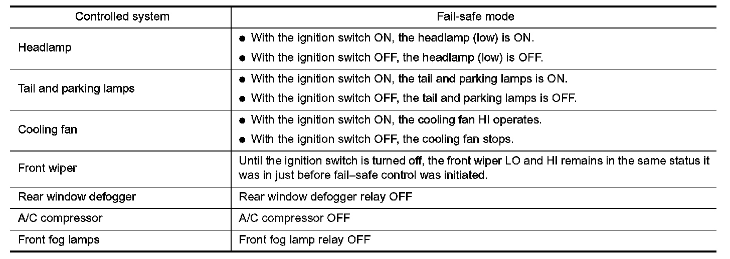 - Operation of control parts by IPDM E/R during fail-safe mode is as shown: