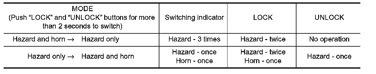 When the LOCK button is pushed, the hazard warning lamp flashes twice and horn chirps once.