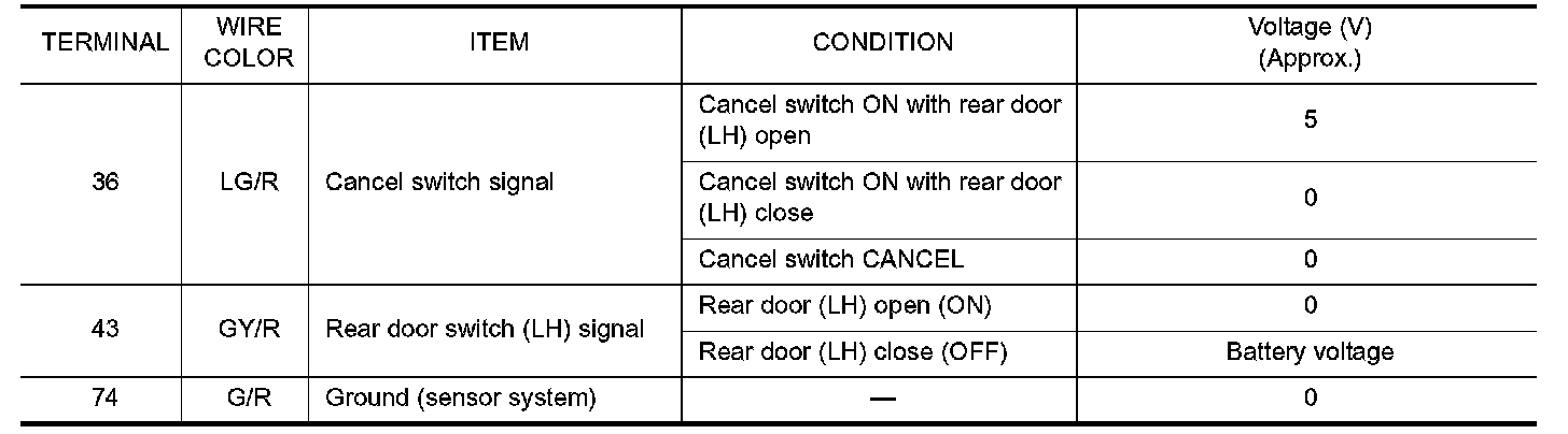 Terminals and Reference Values For Rear Power Seat Control Unit