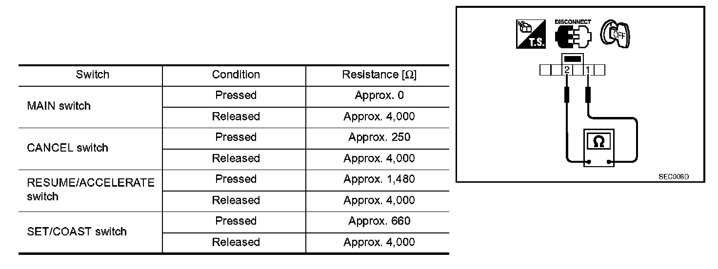 Check continuity between ASCD steering switch terminals 1 and 2 with pushing each switch.