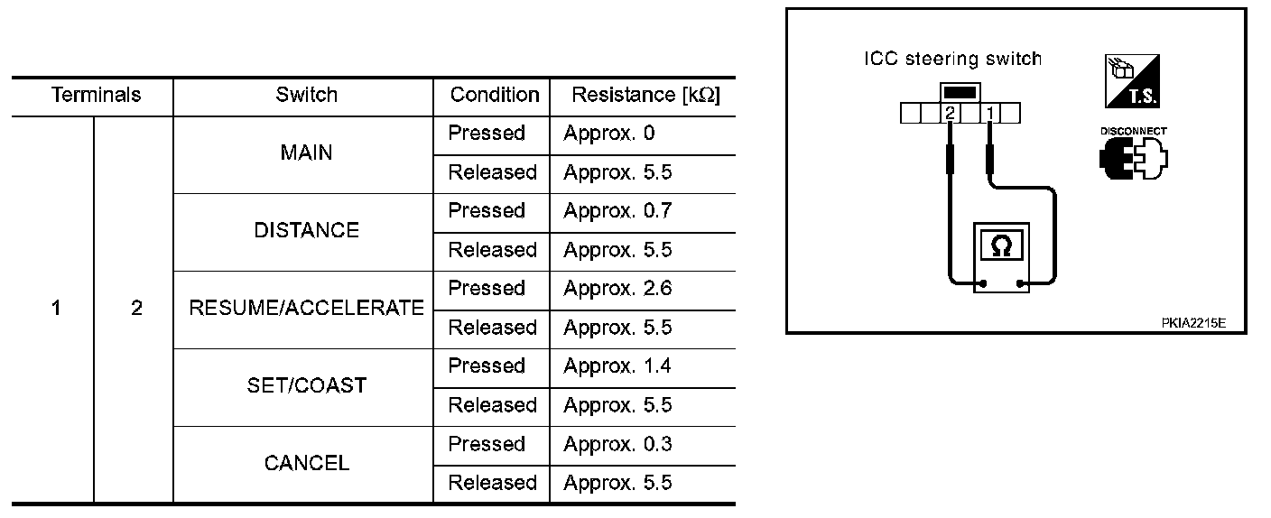 Check resistance between ICC steering switch terminals 1 and 2 by pressing each switch.