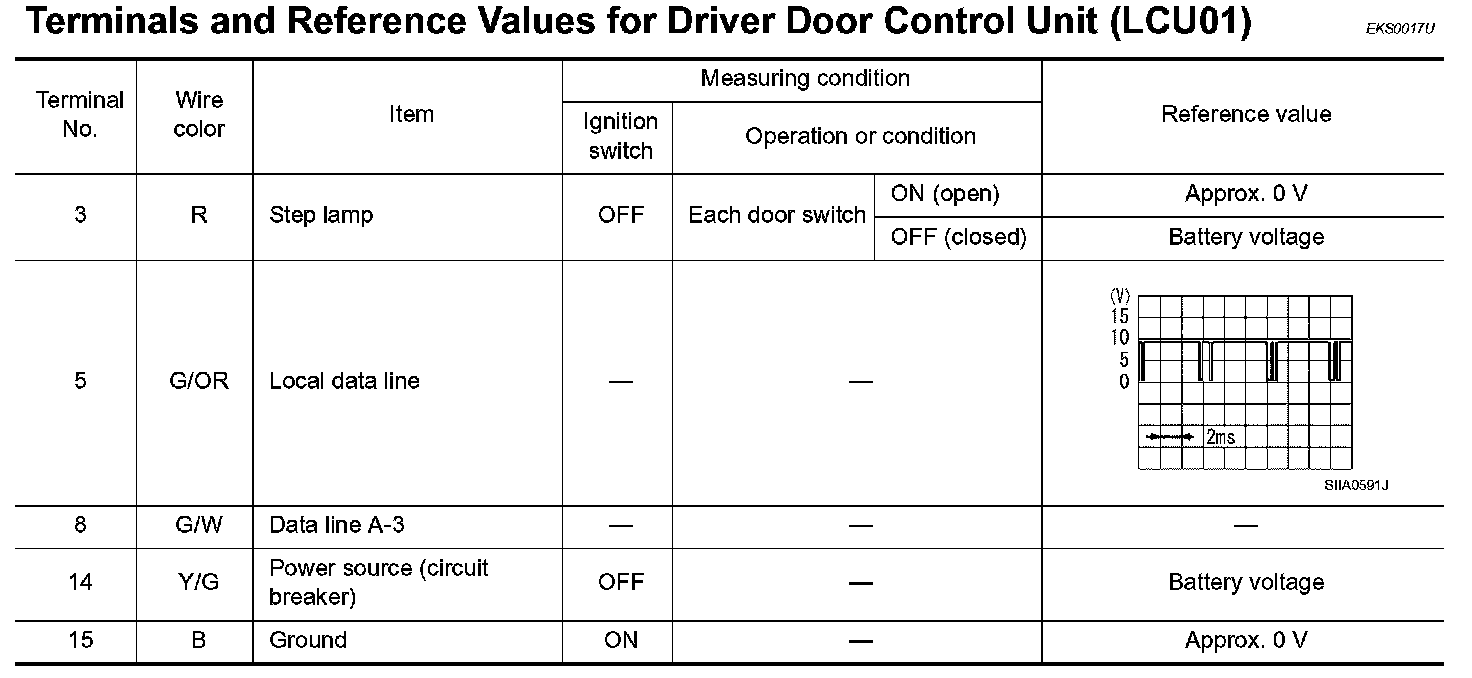 Terminals And Reference Values For Driver Door Control Unit (LCU01):