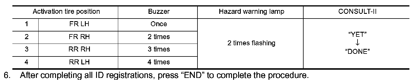 NOTE: Be sure to register the IDs in order from FR LH, FR RH, RR RH, to RR LH, or the self-diagnostic results display will not function properly.