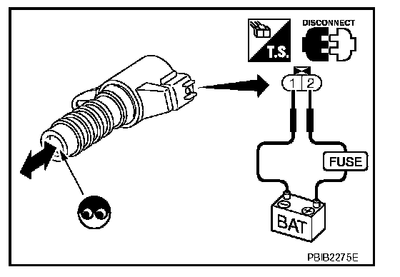 4. Provide 12 V DC between intake valve timing control solenoid valve terminals and then interrupt it. Make sure that the plunger moves as shown in the figure.