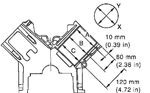 ^ Using a bore gauge, measure the cylinder bore diameter for wear, out-of-round and taper at six different points on each cylinder. ("X" and "Y" directions at "A", "B" and "C")