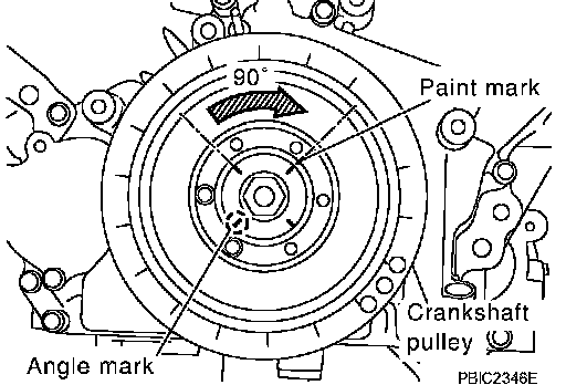 Select one most visible notch of the four on bolt flange. Corresponding to the selected notch, put a mating mark (such as paint) on crankshaft pulley.