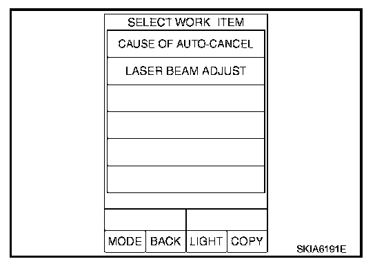 CAUTION: Complete all the procedures once "LASER BEAM ADJUST" mode is entered in CONSULT-II. When the procedure is discontinued, the ICC system is inoperable.
