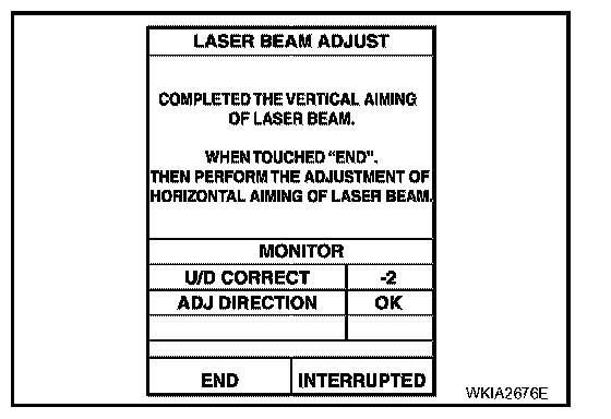 9. When "U/D CORRECT" value indicates ±4, confirm that the value remains within ±4 for at least 2 seconds while nothing is touching the ICC sensor. When "COMPLETED THE VERTICAL AIMING OF LASER BEAM" appears on screen, touch "END".
