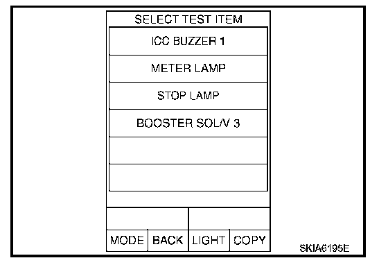 2. Touch any of "ICC BUZZER 1", "METER LAMP", "STOP LAMP" and "BOOSTER SOL/V 3" on "SELECT TEST ITEM" screen.