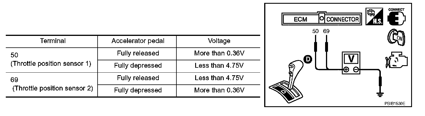 5. Check voltage between ECM terminals 50 (TP sensor 1 signal), 69 (TP sensor 2 signal) and ground under the given conditions.