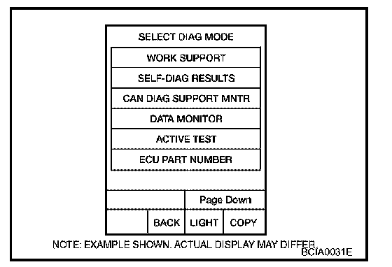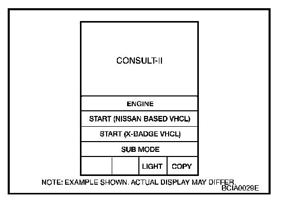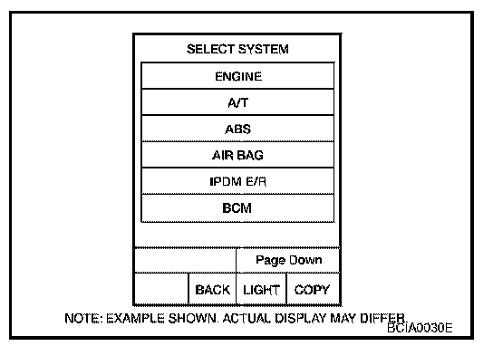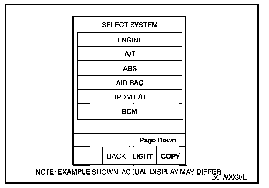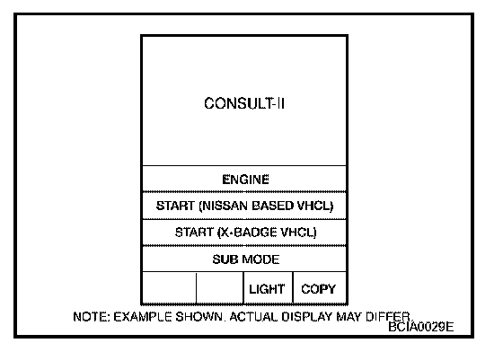 3. Touch "BCM" on "SELECT ITEM" screen. If "BCM" is not indicated, refer to "CONSULT-II Data Link Connector (DLC) Circuit".