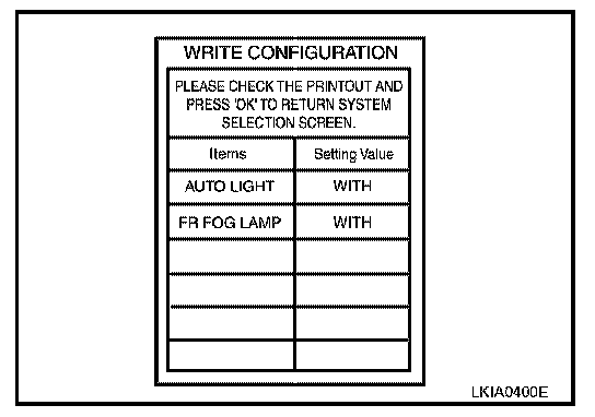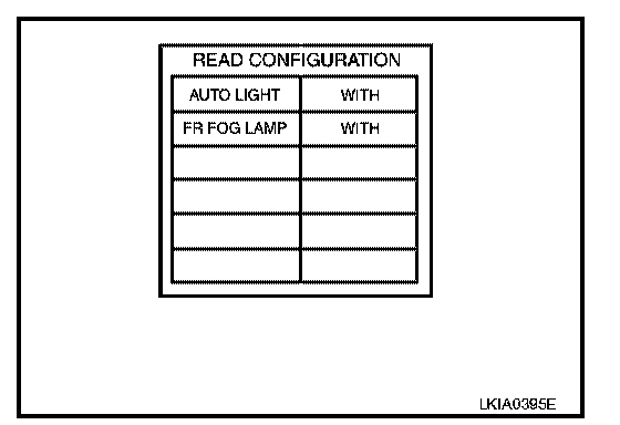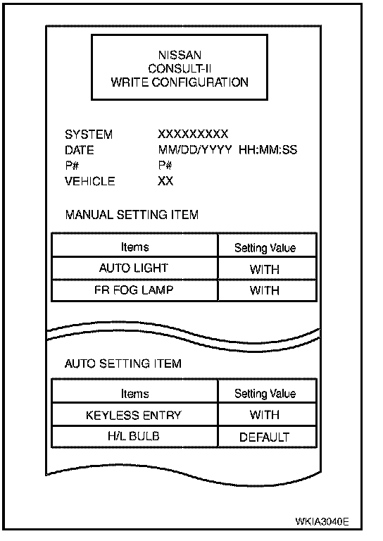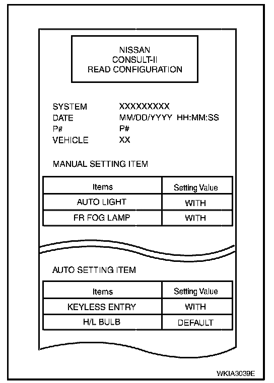 8. Configuration of current BCM is printed out automatically. A listing of manual setting items and auto setting items will be displayed. Auto setting items are preset and cannot be changed. Manual setting items can be set by using WRITE CONFIGURATION PROCEDURE. Refer to "WRITE CONFIGURATION PROCEDURE".