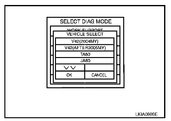 6. Touch "JA60" and "OK" on "VEHICLE SELECT" screen. For canceling, touch "CANCEL" on "VEHICLE SELECT" screen.