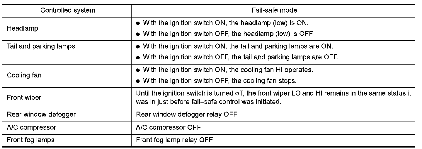 - Operation of control parts by IPDM E/R during fail-safe mode is as shown: