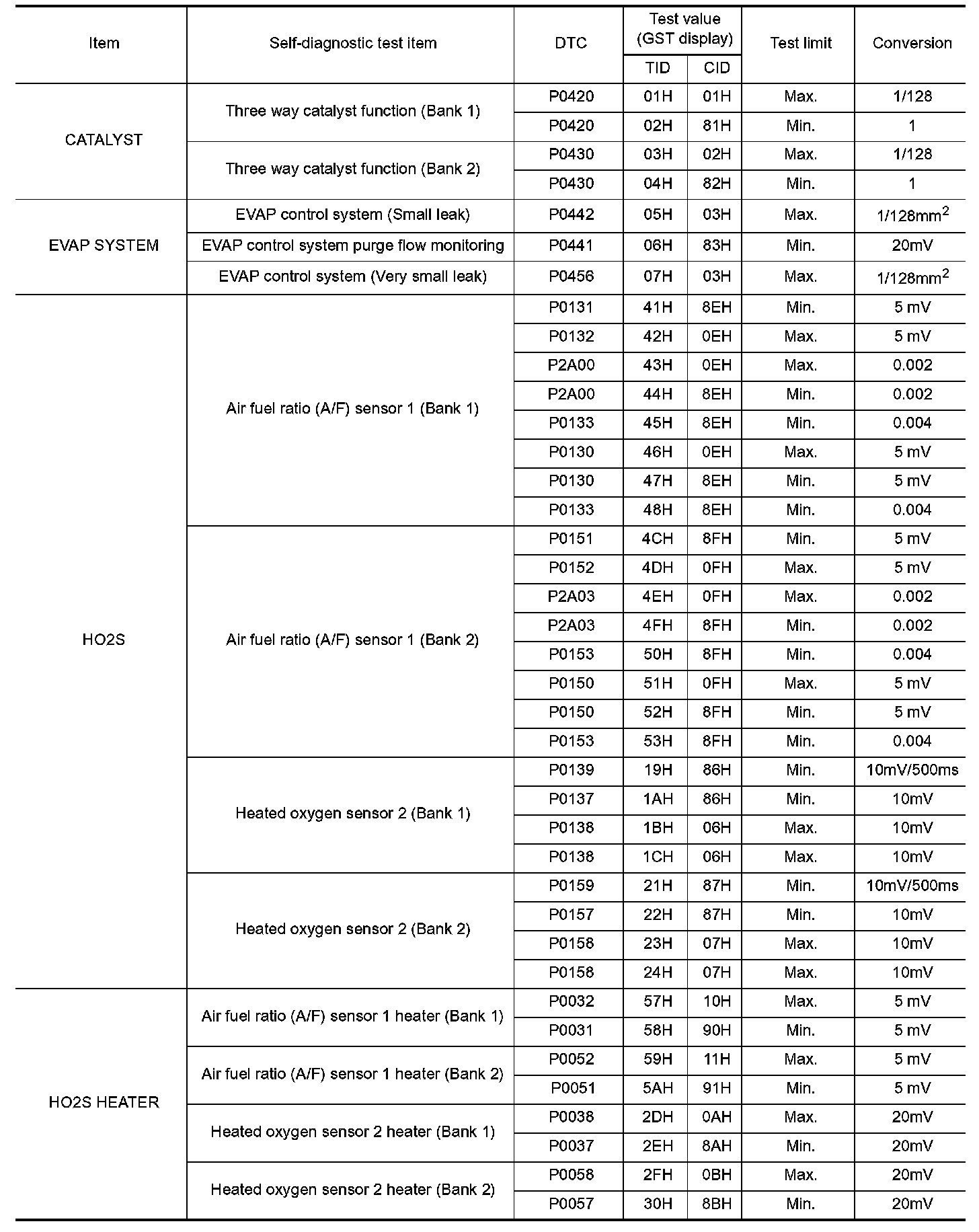 The test value is a parameter used to determine whether a system/circuit diagnostic test is OK or NG while being monitored by the ECM during self-diagnosis. The test limit is a reference value which is specified as the maximum or minimum value and is compared with the test value being monitored.