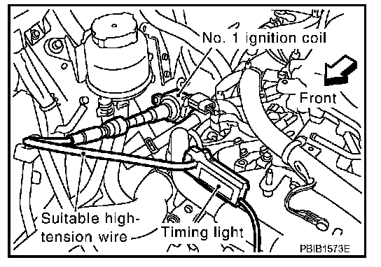 2. Connect No. 1 ignition coil and No. 1 spark plug with suitable high-tension wire as shown, and attach timing light clamp to this wire.