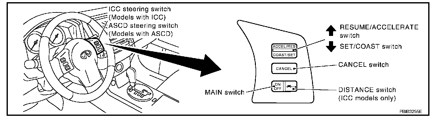 ASCD steering switch has variant values of electrical resistance for each button. ECM reads voltage variation of switch, and determines which button is operated. Refer to "AUTOMATIC SPEED CONTROL DEVICE (ASCD)" for the ASCD function.