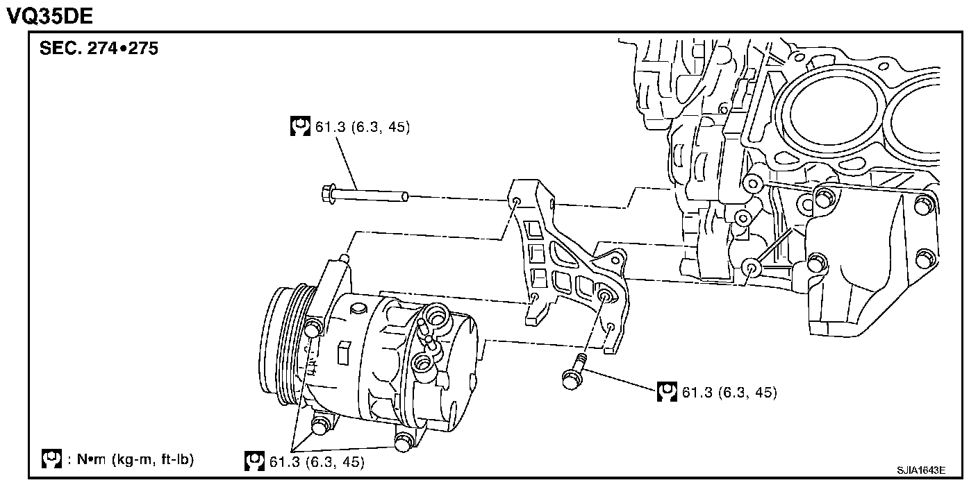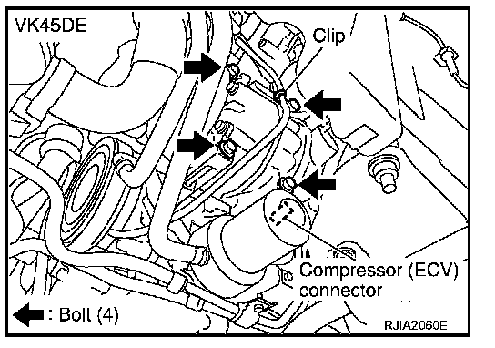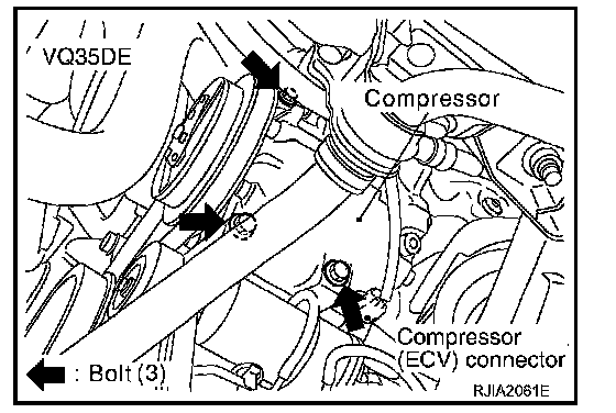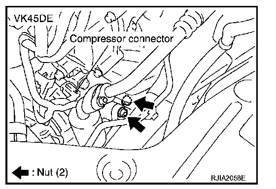 8. Remove A/C compressor belt. Refer to "DRIVE BELTS" (VQ35DE) or "DRIVE BELTS" (VK45DE).