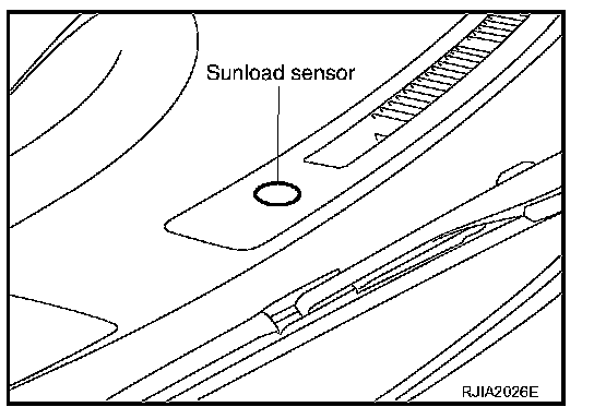 The sunload sensor is located on the passenger's side front defroster grille. It detects sunload entering through windshield by means of a photo diode. The sensor converts the sunload into a current value which is then input into the unified meter and A/C amp.