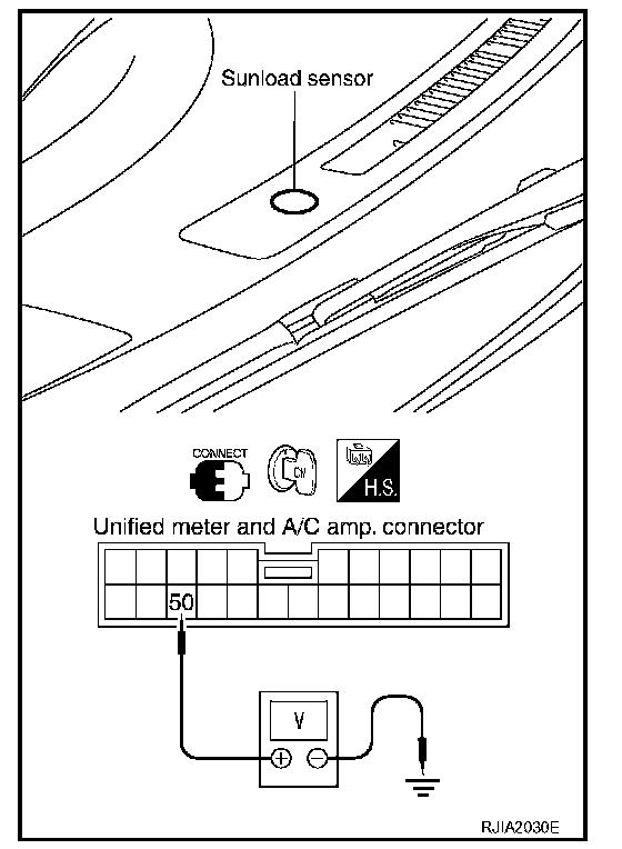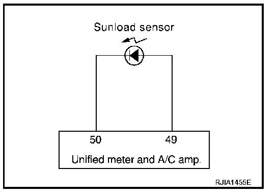 SYMPTOM: Sunload sensor circuit is open or shorted. (25 or -25 is indicated on unified meter and A/C amp. as a result of performing self-diagnosis STEP-2.)